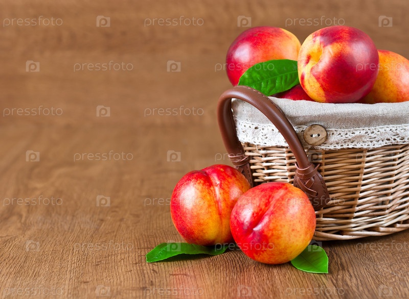 Свежие фрукты нектарины в корзине на деревянном фоне
