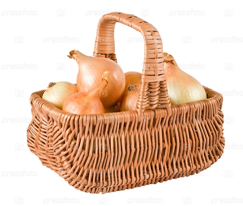 Свежий лук в плетеной корзине. Изолированный, на белом фоне
