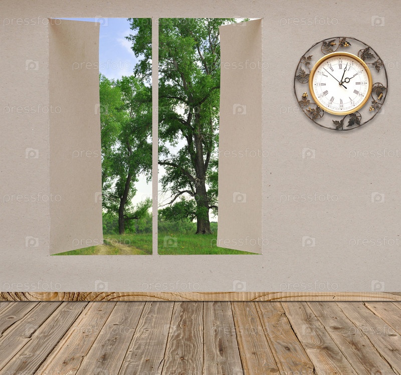 Пустая комната с окном и часами на стене