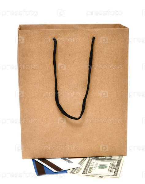 Пакет, пластиковые карточки и наличные деньги