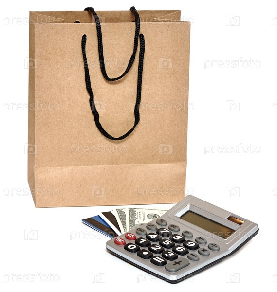 Пакет, пластиковые карточки, калькулятор и наличные деньги