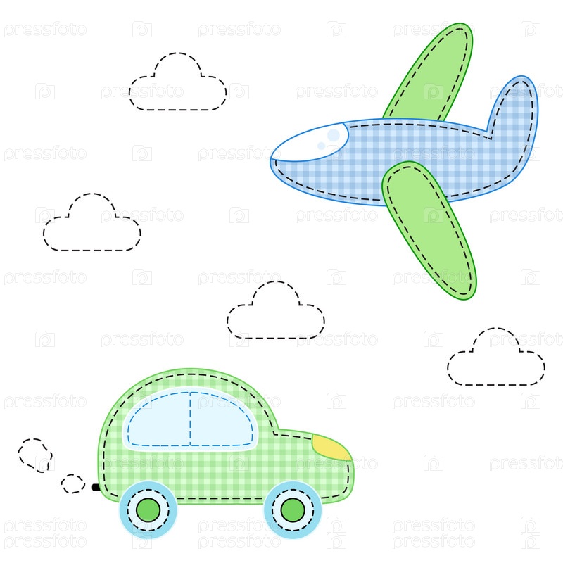 Самолет и автомобиль, детская аппликация на белом фоне