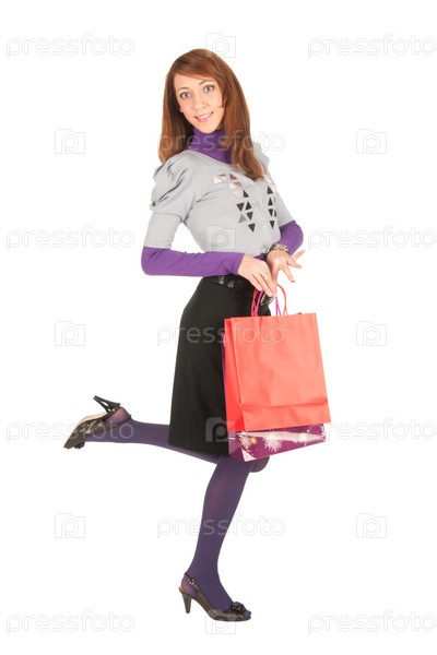 Счастливая молодая женщина с пакетами, изолировано на белом фоне