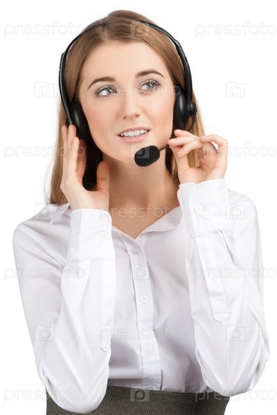 Молодая девушка-оператор службы обработки вызовов на белом фоне