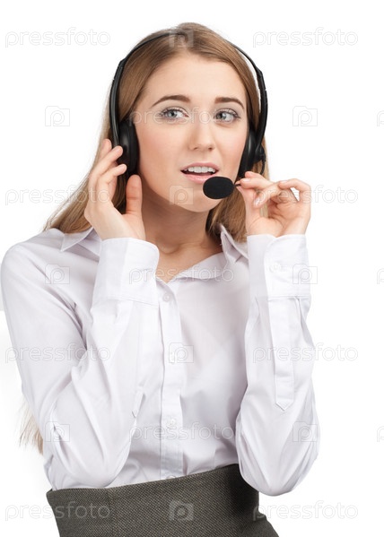 Молодая девушка-оператор службы обработки вызовов на белом фоне