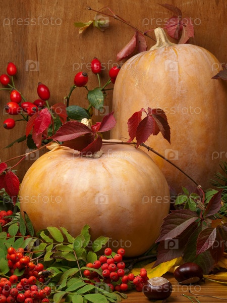 Осенний натюрморт с тыквой и ветками рябины