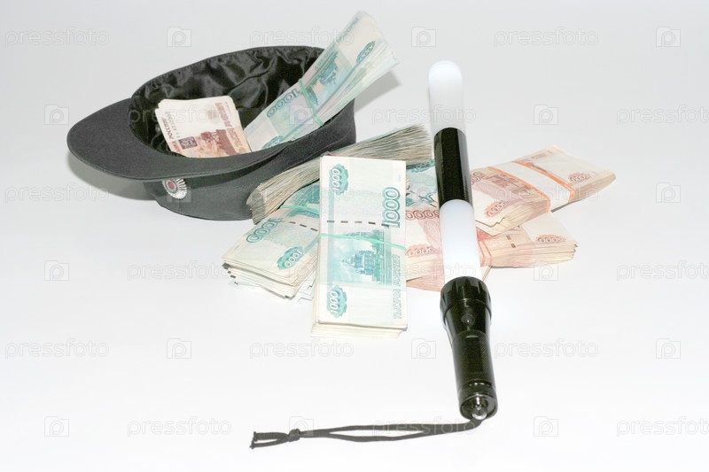 Жезл ГАИ и черная кепка с деньгами на белом фоне