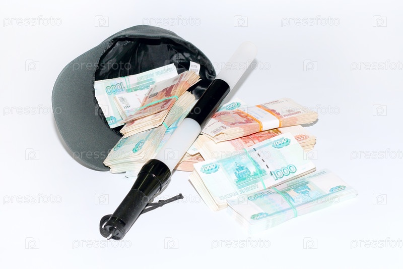 Жезл ГАИ и черная кепка с деньгами на белом фоне