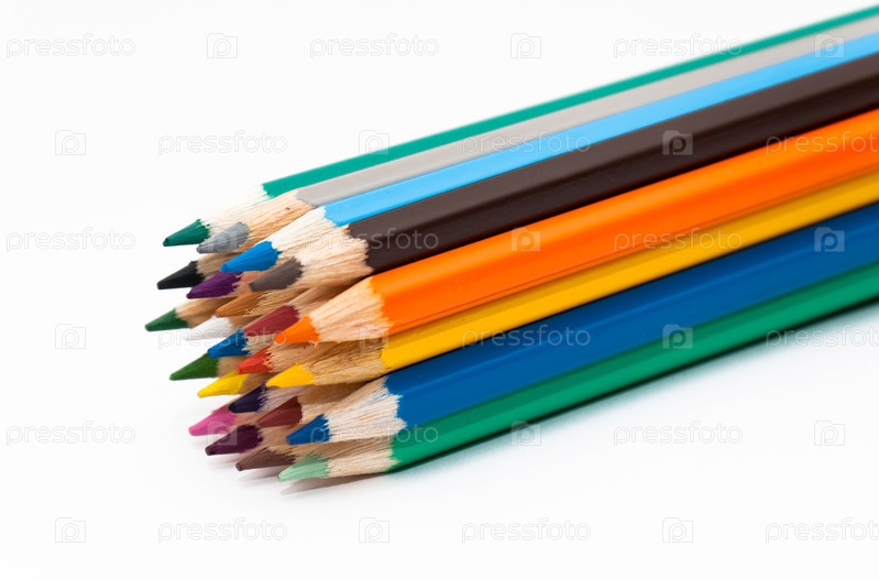 Цветные карандаши лежат по диагонали на белом фоне