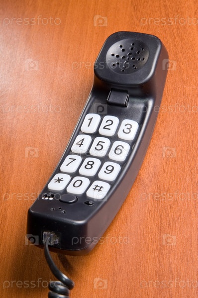 Телефонная трубка с кнопками на деревянном столе