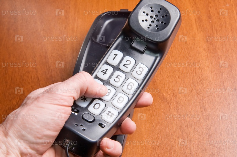 Черная телефонная трубка в мужской руке на фоне деревянного стола