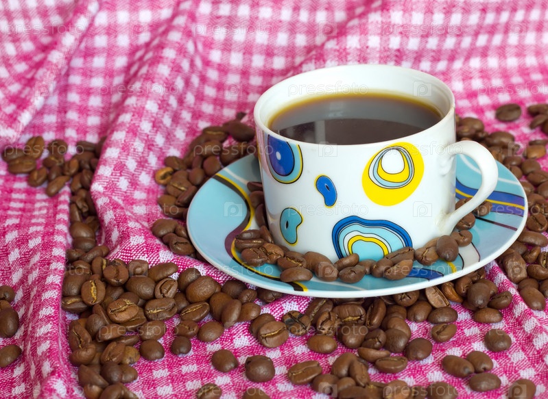 Чашка с кофе и кофейные зерна на розовом фоне