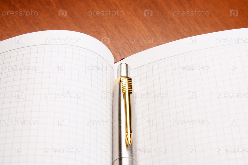 Открытый блокнот с ручкой на офисном столе