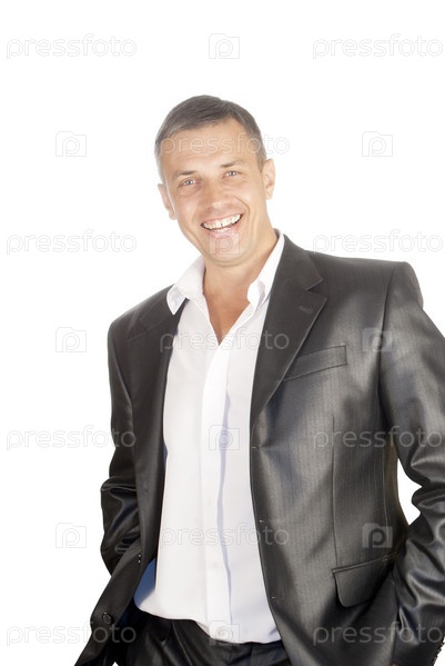 Улыбающийся мужчина в костюме на белом фоне