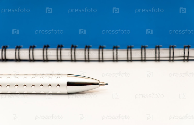 Серебристая ручка и синяя тетрадь на белом фоне