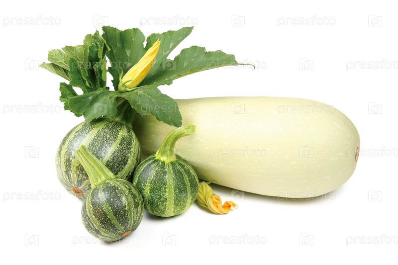 Большой кабачок и несколько тыковок с листьями на белом фоне