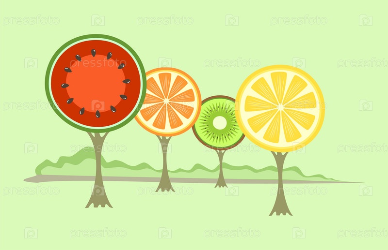 Абстрактные фруктовые деревья: арбуз, апельсин, лимон, киви