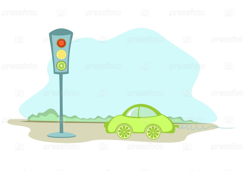 Автомобиль с фруктовыми колесами и светофор на дороге