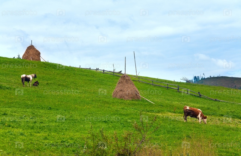 Корова и лошадь на зеленом лугу