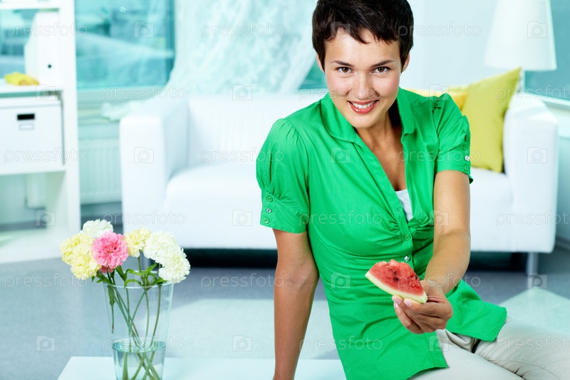 Девушка с кусочком арбуза в руках