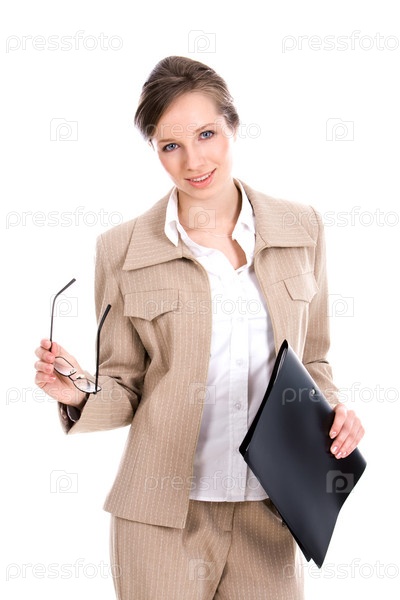 Портрет умной деловой женщины в костюме с папкой в руке на белом фоне