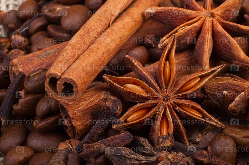 Звездчатый анис, палочки корицы и кофейные зерна