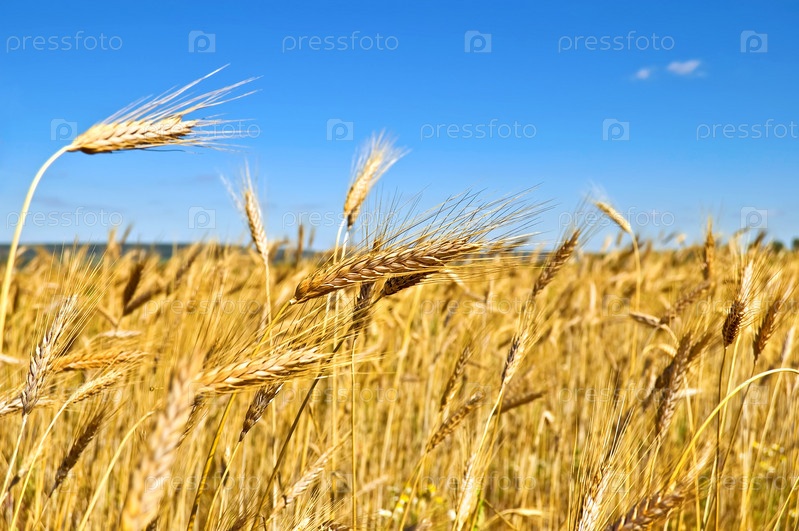Золотистые колосья пшеницы на фоне синего неба