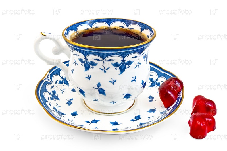 Чашка кофе и мармелад в форме сердечек на белом фоне