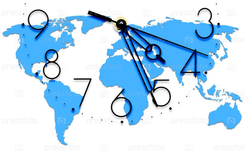 Часы в виде карты мира, нижняя часть. Белый фон, крупный план