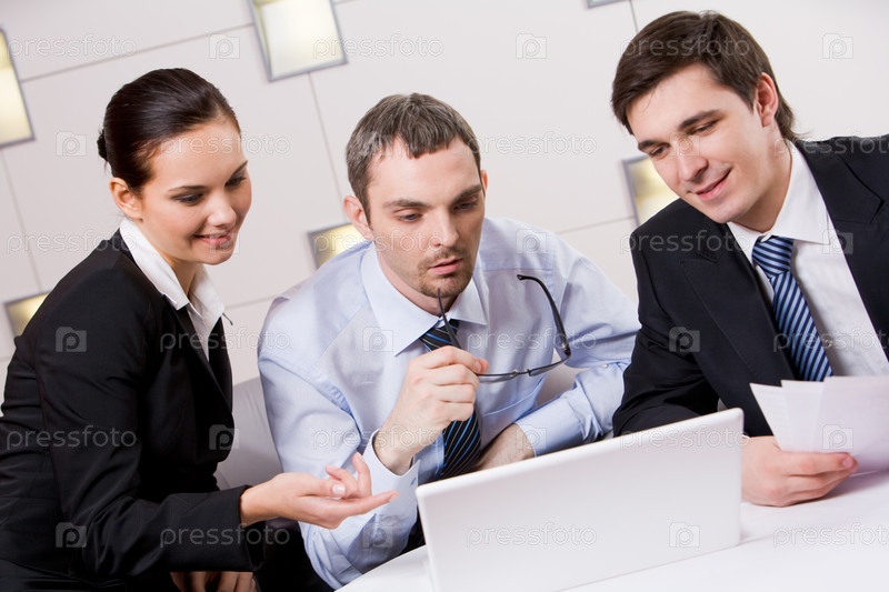Портрет исполнительных сотрудников, смотрящих на монитор ноутбука с задумчивым боссом между ними и обсуждающих новый проект