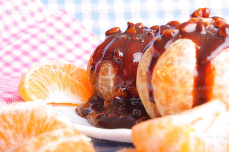 Мандарин и шоколад на белой тарелке (вблизи)