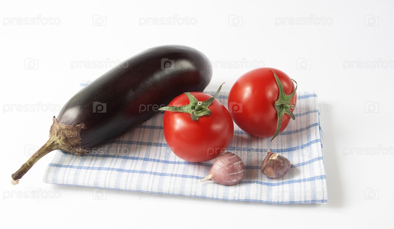 Баклажан, два помидора и чеснок на салфетке. Белый фон