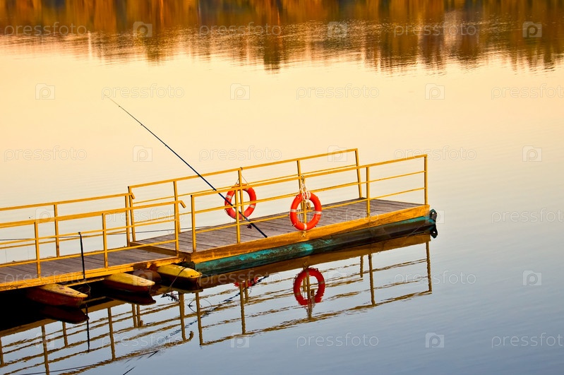 Пирс с желтыми перилами и деревянным настилом на воде, спиннинг и два красных спасательных круга, рассвет