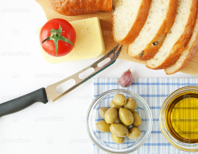 Хлеб Чиабатта на доске, оливковое масло, зеленые оливки в стеклянных блюдцах, помидор, чеснок и нож. Белый фон