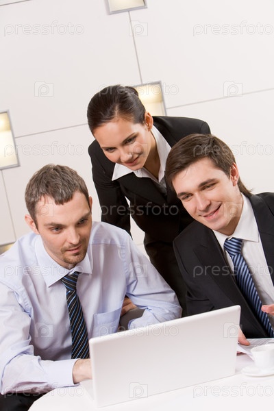 Портрет руководителей, которые с улыбкой смотрят на монитор ноутбука и думают о новом проекте