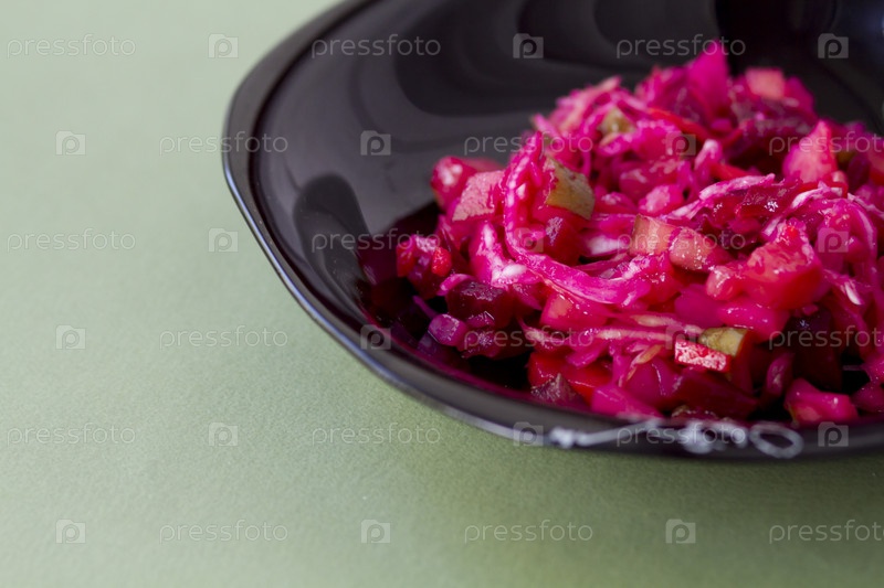 Винегрет в глубокой тарелке темного стекла. Крупный план, белый фон