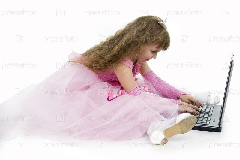 Девочка в розовом платье с ноутбуком на белом фоне