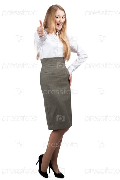 Портрет привлекательной деловой женщины, держащей поднятый вверх большой палец руки, изолировано на белом фоне