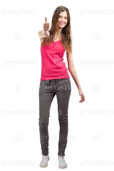 Портрет девушки, держащей поднятый вверх большой палец руки, изолировано на белом фоне