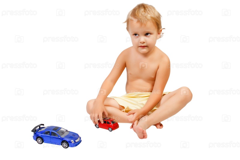 Мальчик играет с машинками на белом фоне