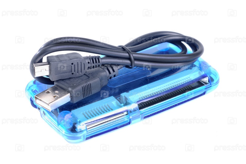 Синий карточный читатель и USB-кабель, изолированные на белом