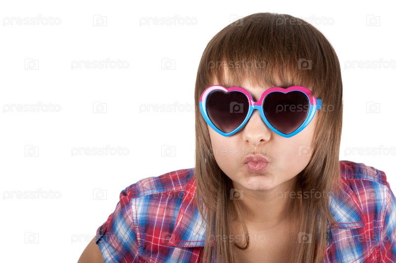 Портрет красивой девушки в солнцезащитных очках в форме сердца на белом фоне