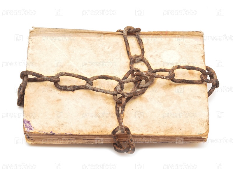 Старая книга с ржавой цепью на белом фоне