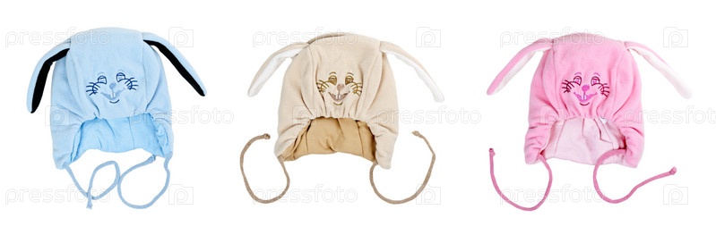 Три разноцветных детских шапочки в форме морды кролика на белом фоне