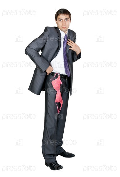 Бизнесмен в костюме и из кармана висит розовый бюстгальтер на белом фоне