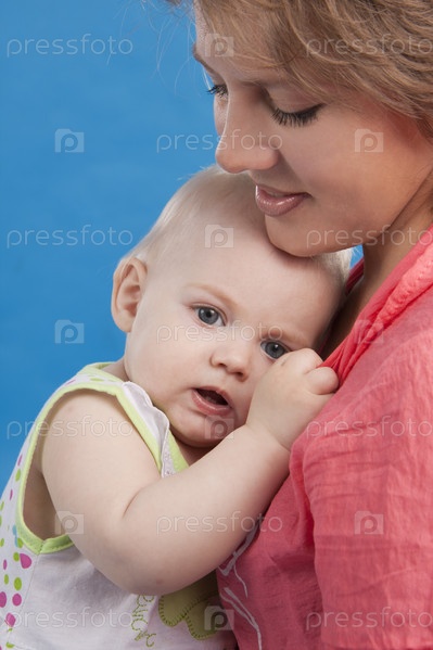 Мать с маленькой дочкой на синем фоне