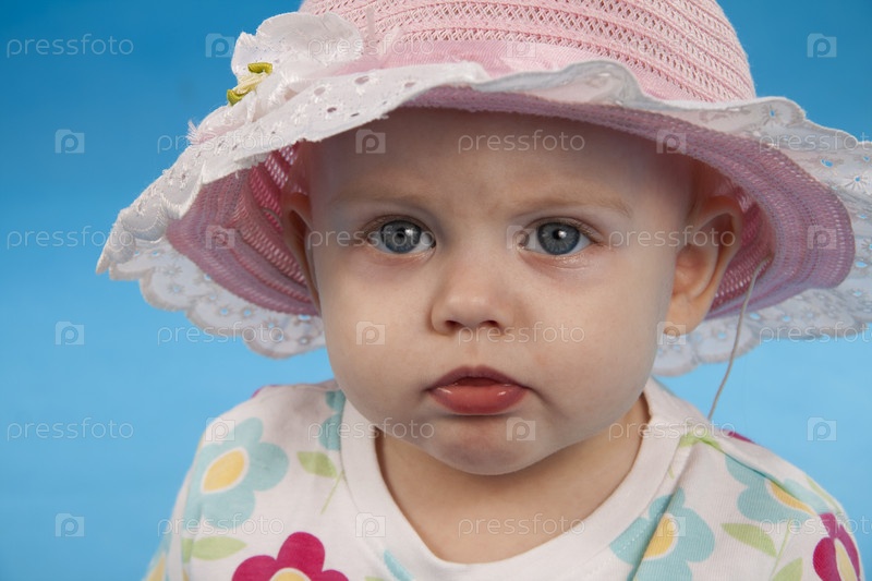 Маленькая девочка в шляпе на синем фоне