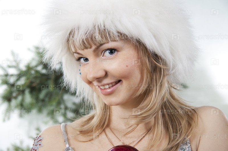 Светловолосая девушка в меховой шапке на фоне веток ели