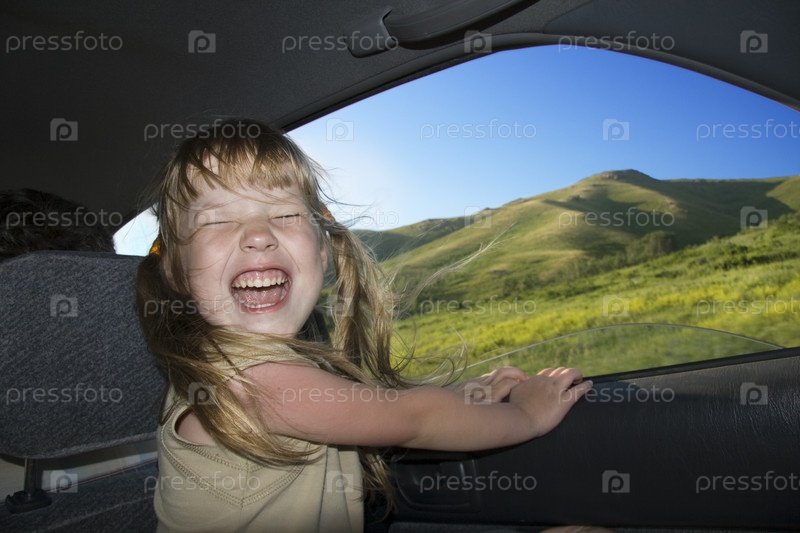 Радостная маленькая девочка сидит у открытого окна машины