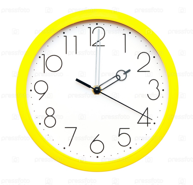 Желтые настенные часы на белом фоне